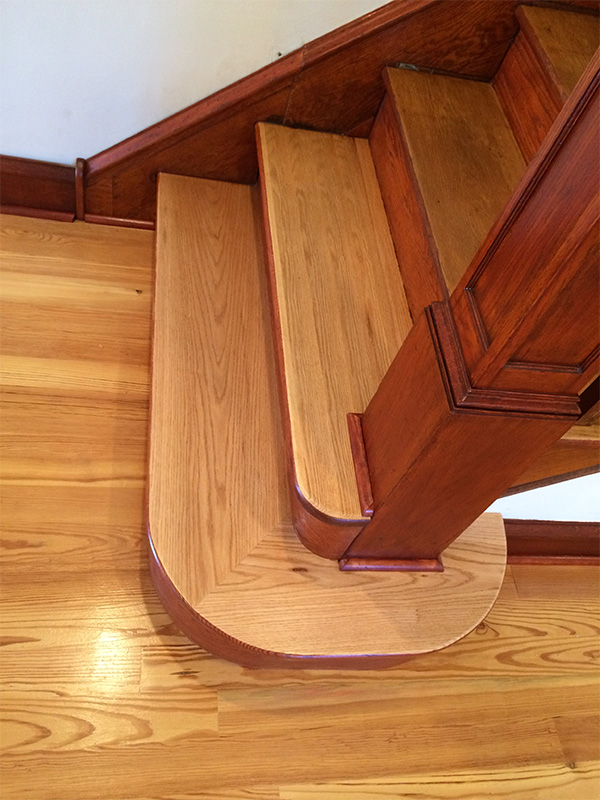 Wall-to-wall, factory-recovered, custom-milled, antique Heart Pine hardwood floors Refinished staircase with gunstock-stained verticals